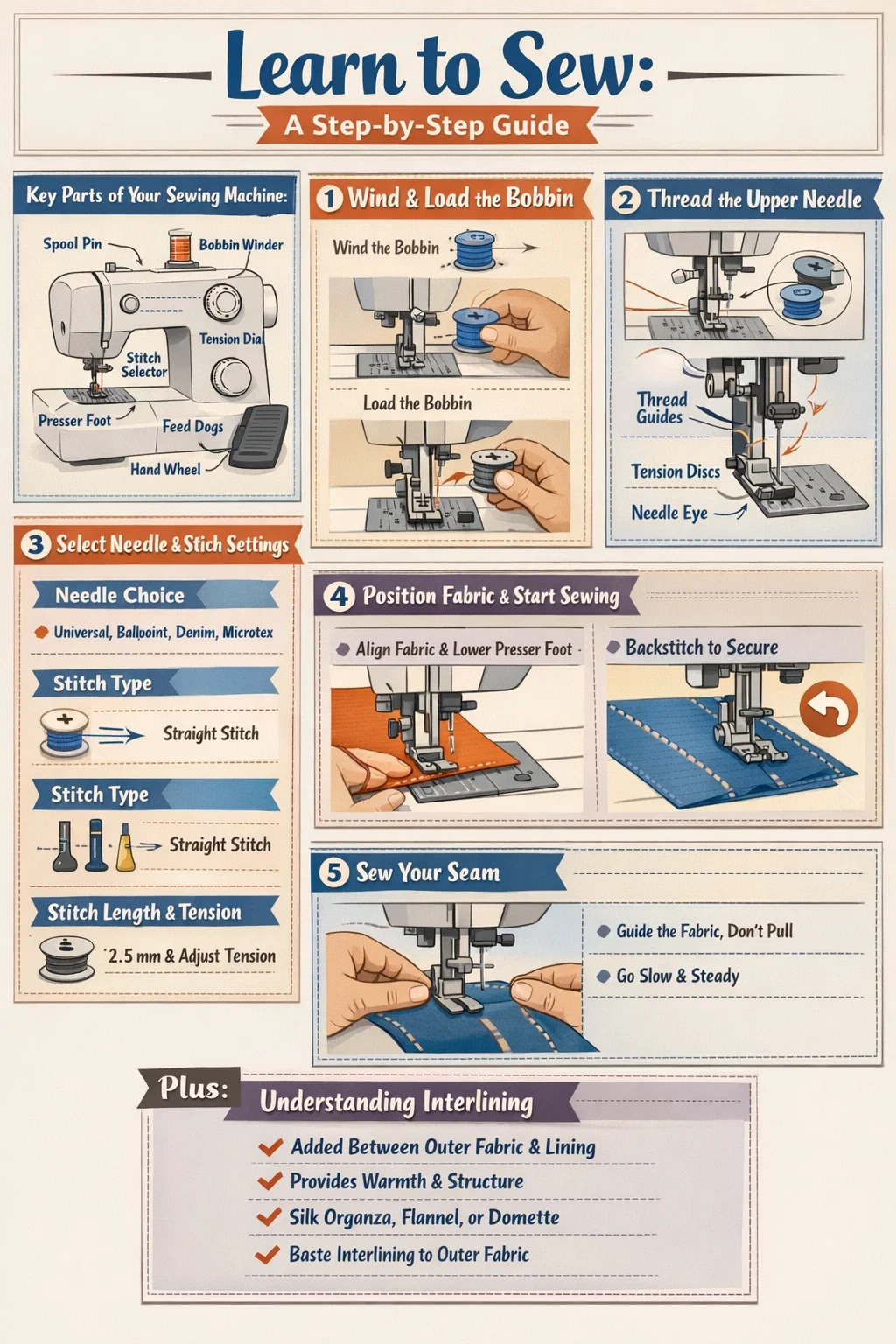 Das schrittweise Erlernen der Bedienung einer Nähmaschine ist einfacher, als die meisten Anfänger erwarten. Der Kernprozess besteht aus fünf Schritten: Maschine einrichten, Spule aufspulen und laden, Obernadel einfädeln, Stich auswählen und nähen. Sobald Sie diese Grundlagen beherrschen, können Sie alles in Angriff nehmen, von einfachen Säumen bis hin zu strukturierten Kleidungsstücken Einlage – eine versteckte Schicht, die zwischen Oberstoff und Futter eingenäht ist und für mehr Körper, Form und Wärme sorgt. In dieser Anleitung wird jeder Schritt im Detail beschrieben, sodass Sie vom kompletten Anfänger zum erfahrenen Näher werden können.