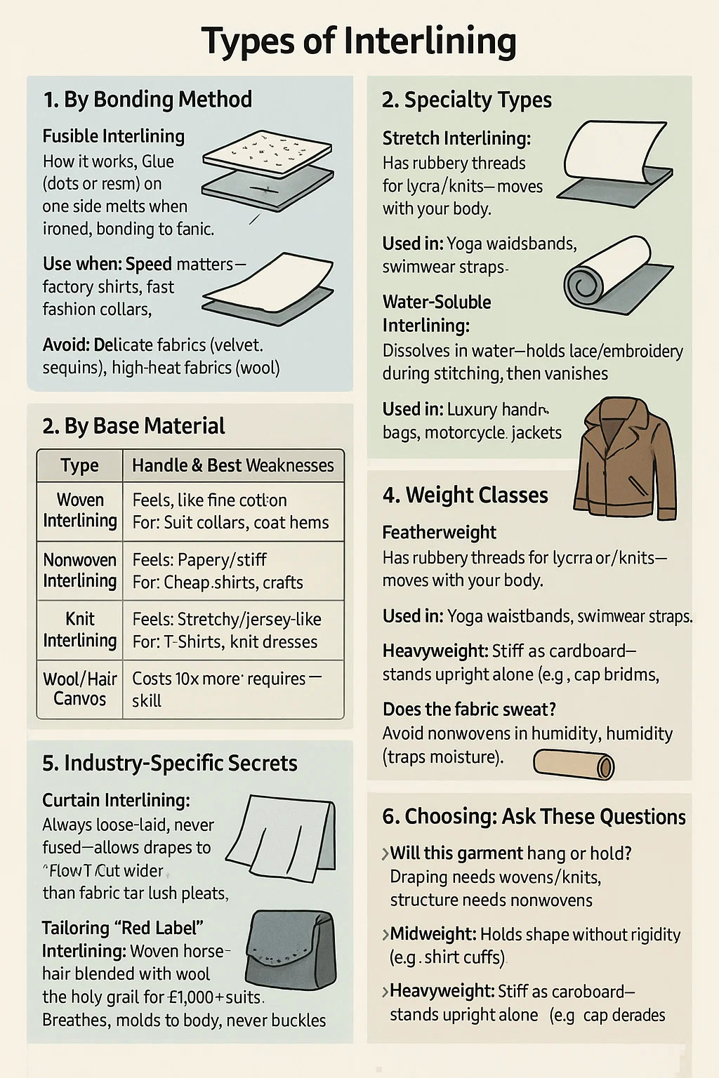 | Gewebte Einlage | • Fühlt sich an: Wie feine Baumwolle.• Für: Anzugkragen, Mantelsäume | Falten, wenn das Korn falsch geschnitten wird |