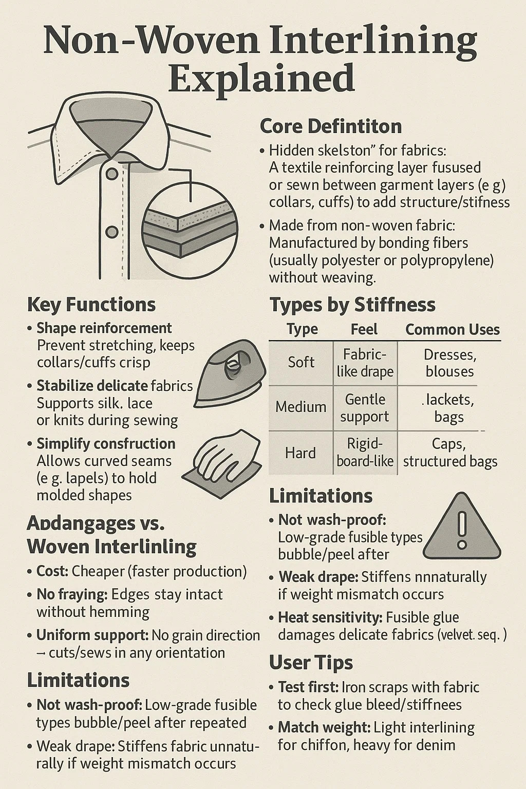 "Hidden Skeleton" für Stoffe: Eine Textilverstärkungsschicht, die zwischen Kleidungsschichten (z. B. Kragen, Manschetten) verschmolzen oder genäht wurde, um Struktur/Steifheit hinzuzufügen.