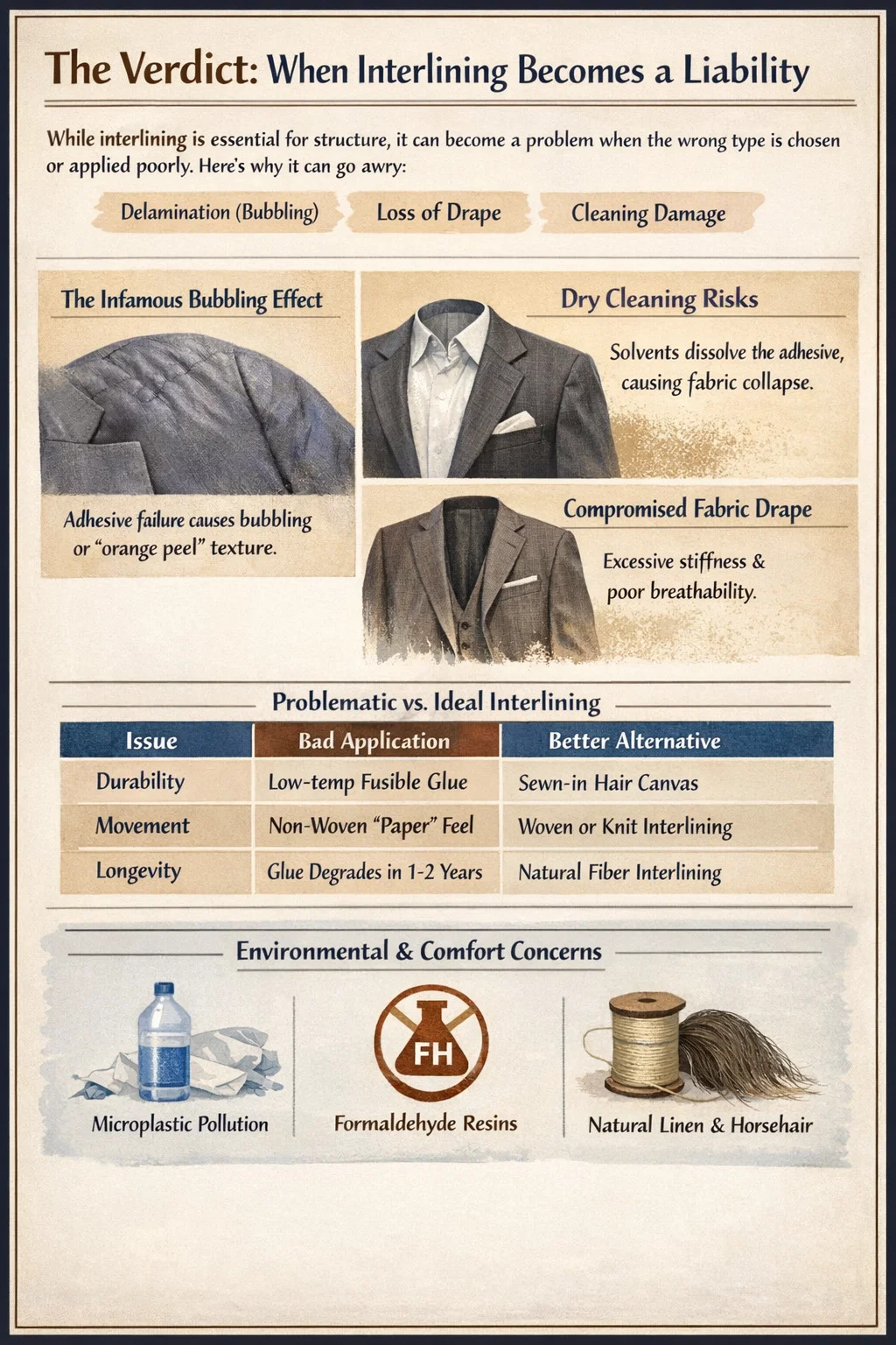 Um es klar zu sagen: Einlage ist nicht grundsätzlich schlecht ; Tatsächlich ist es für die Struktur von wesentlicher Bedeutung. „Schlecht“ wird es jedoch, wenn der falsche Typ gewählt oder schlecht angewendet wird. Zu den Hauptgründen, warum eine bestimmte Einlage als schädlich für ein Kleidungsstück angesehen werden könnte, gehören: Delaminierung (Blasenbildung) , ein Verlust des natürlichen Faltenwurfs , einnd nachteilige Reaktionen auf die Reinigung . Wenn die Verbindung zwischen der Einlage und dem Oberstoff bricht, entstehen bleibende ästhetische Schäden, die nicht rückgängig gemacht werden können.