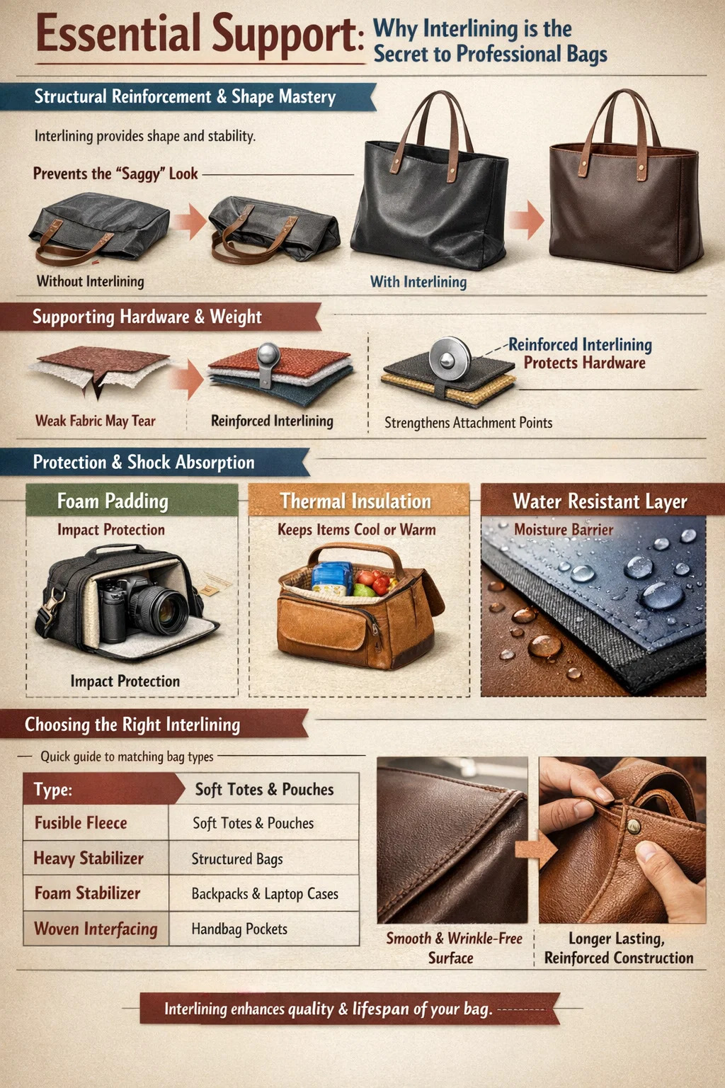 Der Hauptgrund für die Verwendung Einlage im Taschenbau ist vorzusehen strukturelle Integrität und langfristige Formbeständigkeit Dieser Stoff allein kann das nicht erreichen. Ohne diese verborgene Schicht würden die meisten Taschen unter ihrem eigenen Gewicht oder dem Gewicht der darin enthaltenen Gegenstände zusammenbrechen und schlaff, faltig und unvollendet wirken. Durch Hinzufügen des richtigen Einlage Verwandeln Sie ein einfaches Stück Stoff in ein funktionales 3D-Objekt, das aufrecht steht, seinen Inhalt schützt und den Strapazen des täglichen Gebrauchs standhält.